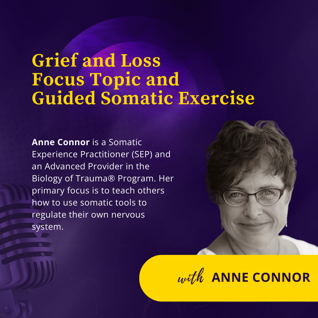 A 28-minute session with somatic practitioner Anne Connor on grief and loss. She taught practical, body-based tools—grounding, titration, and pendulation—to help regulate the nervous system while processing grief. Anne explained how loss can layer in the body, shaping adult patterns (often rooted in childhood loss), and how building tolerance for discomfort helps us stay present with grief without shutting down—key for both personal healing and supporting others.